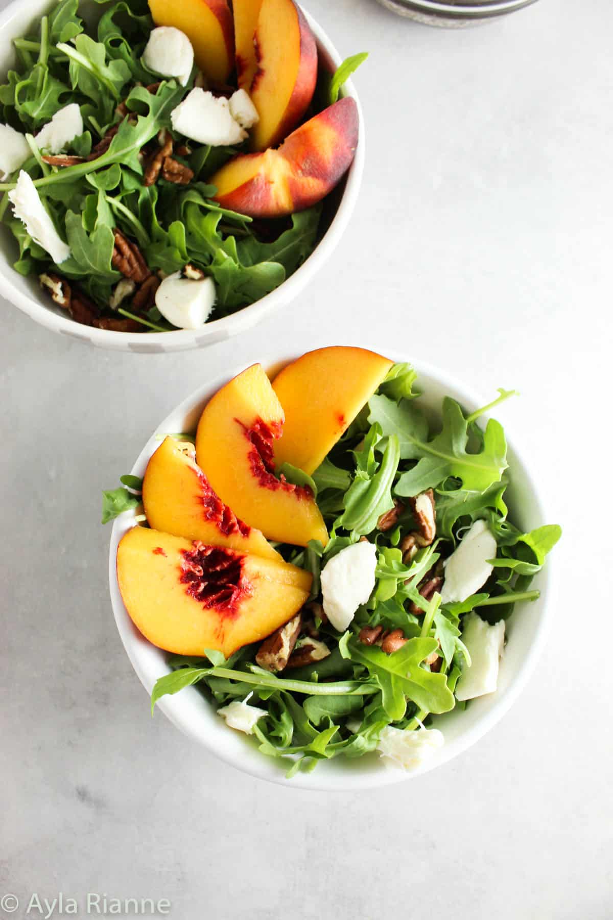 - arugula: baby arugula has a little peppery bite that balances the sweetness of the peach perfectly. Mix in your favorite greens like romaine, spring mix, or green leaf lettuce or swap for baby spinach.